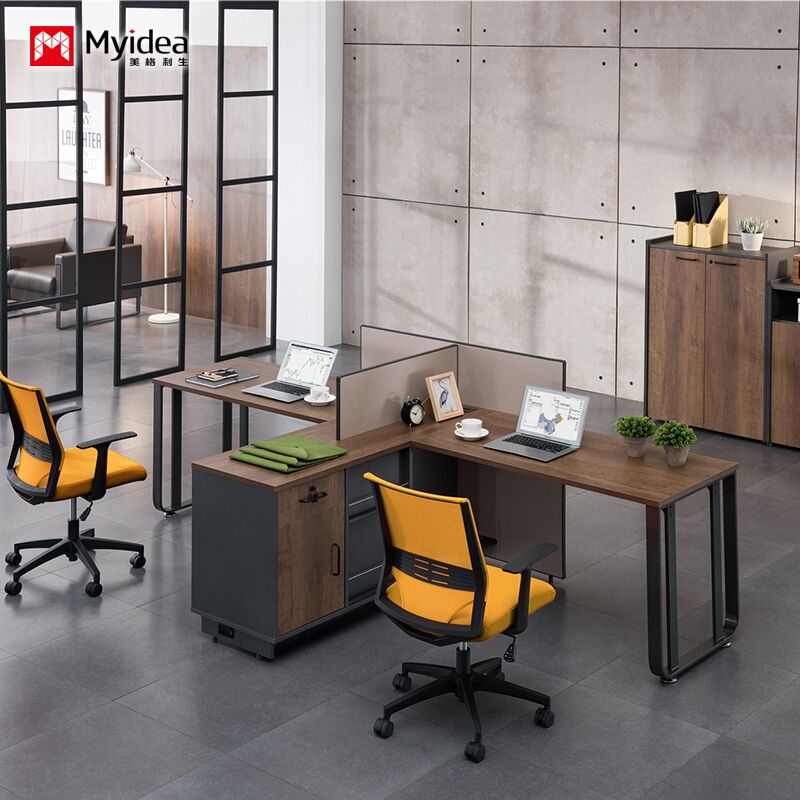 مكتب مكتبي لشخصين مع خزانة جانبية للتخزين بساق فولاذية، مكتب للموظفين مصنوع من مادة لوح الميلامين